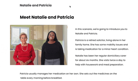 This time I used a interaction storyboard for Natalie and Patricia’s story, but the interaction is confined to a multiple-choice knowledge check. I divided the scenario into a series of mini-episodes outlining a progression in the story (in this case I’ve opted to illustrate the ‘good’ path). After each mini episode, I added a knowledge check question, summarising the situation and asking the learner what to do next and giving them three options (good/bad/not-great).