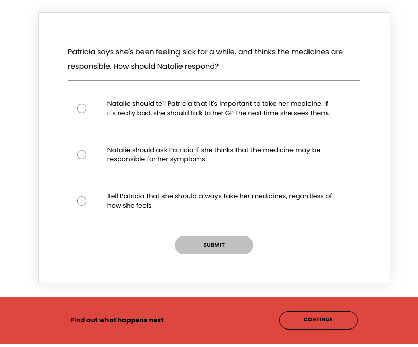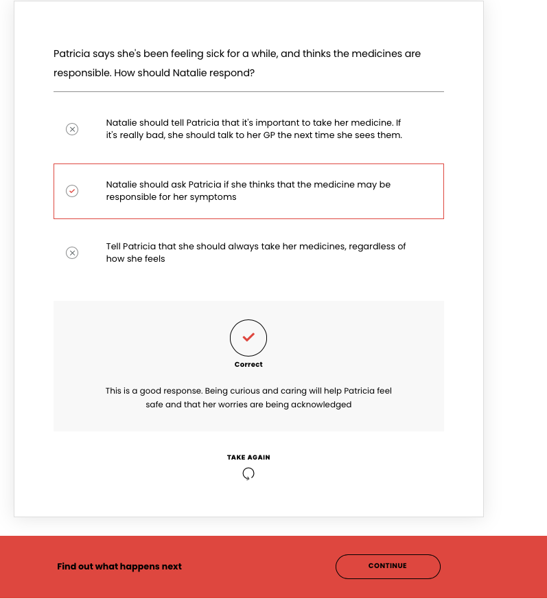 The learner can take the question again to check on the feedback for the other answers, or they can move on to the next mini episode by selecting the Continue button.
