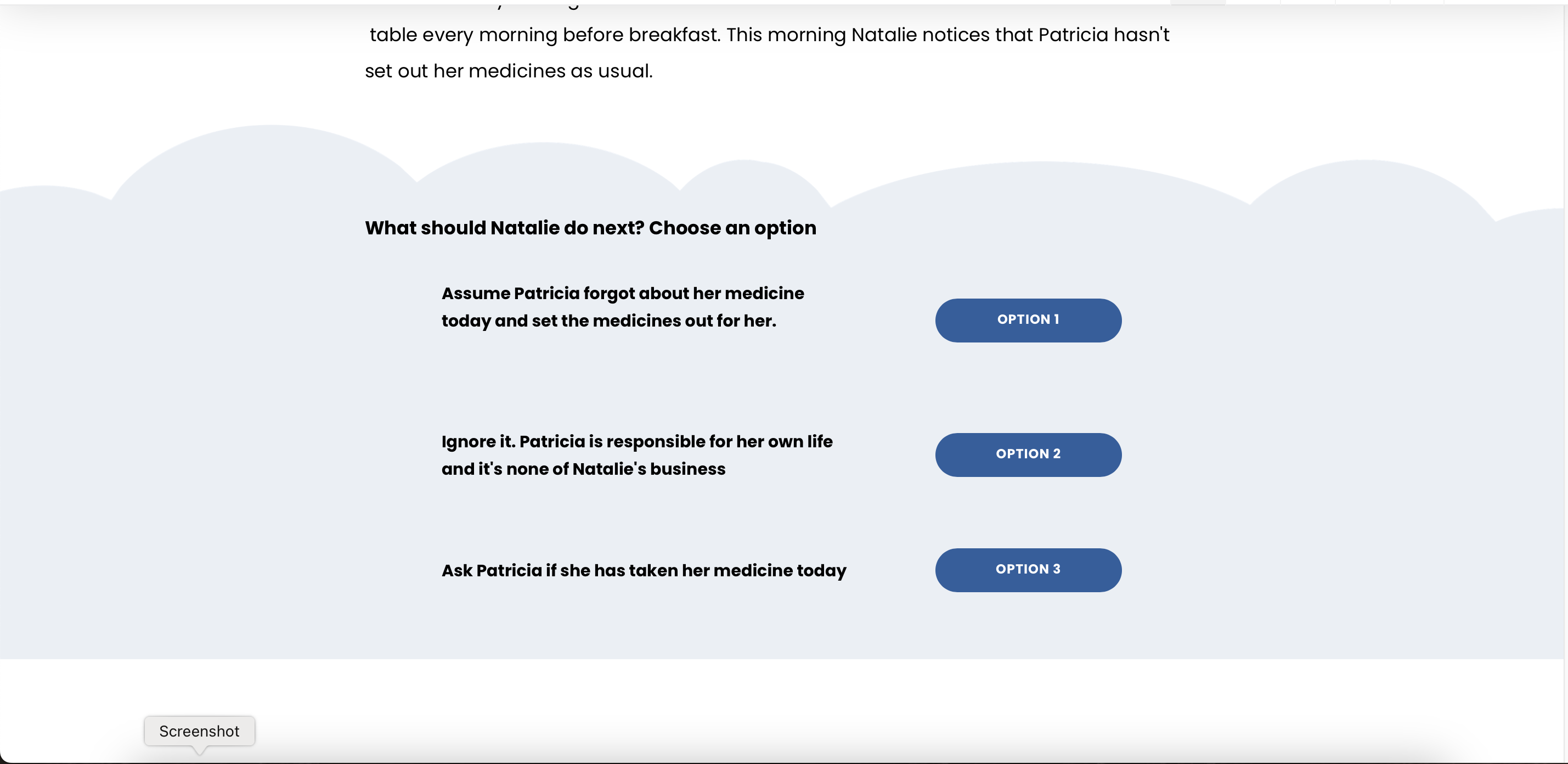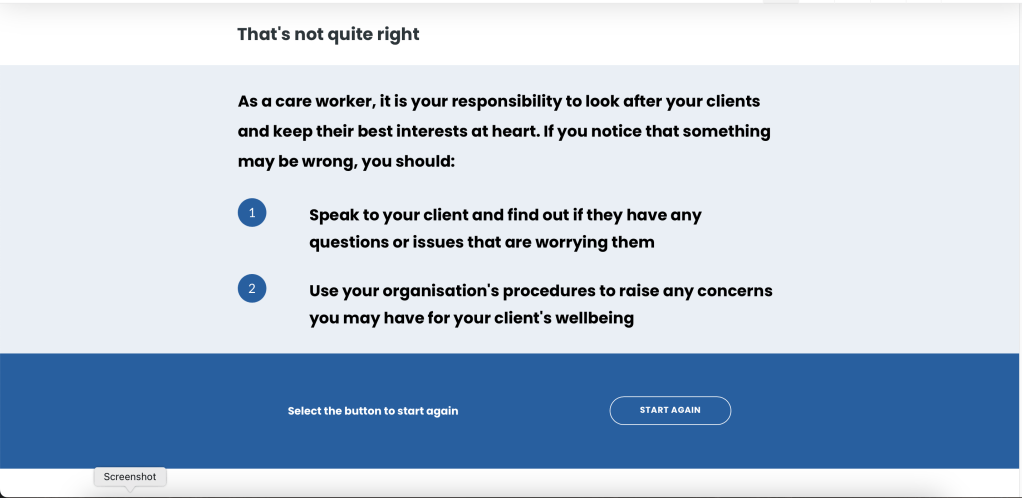 However, this time, the story changes according to the choices the learner makes. In this example, the ‘bad’ path ends with Patricia snapping angrily at Natalie and the ‘meh’ path leads to a reminder of Natalie’s responsibilities as a care worker, plus an option to start again.