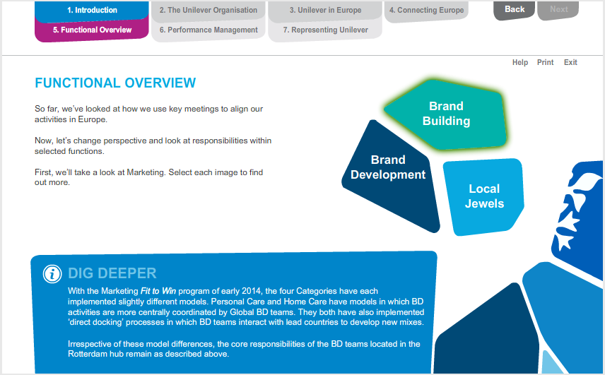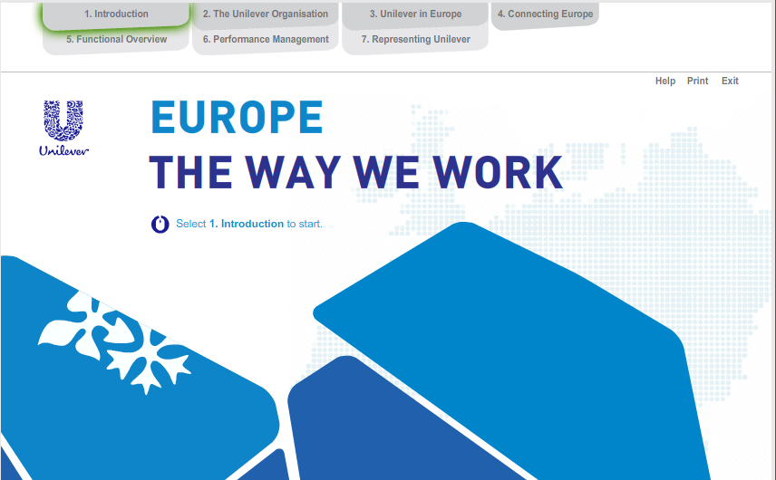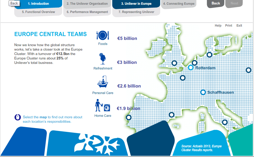 Working with our design and development partners, we created a 30 minute module that used animation and interactivity to first provide a Europe-wide view of the Unilever reporting structure, with some facts and figures about the region’s contribution to the various global product categories.